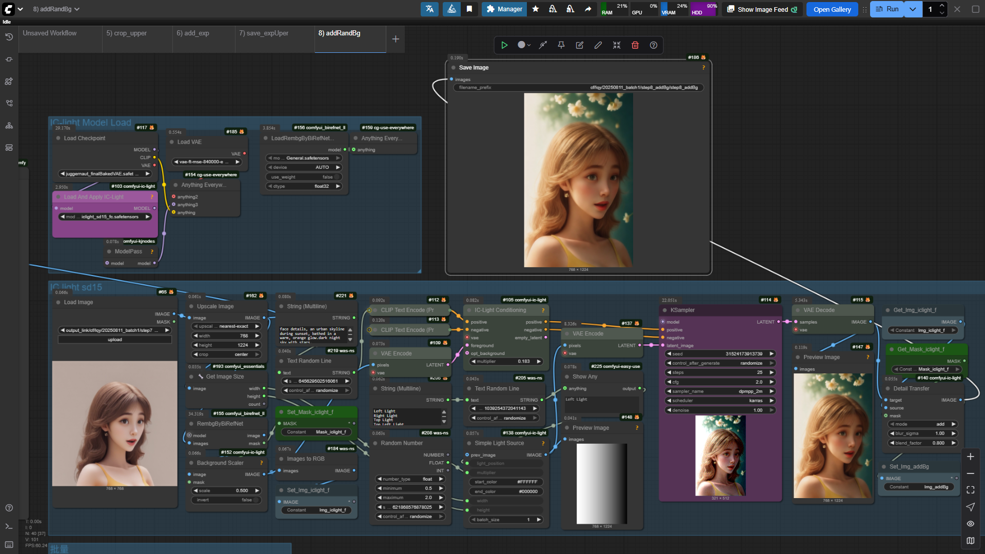 • SD放大+FaceDetail,SD放大过程中为防止和原图相差过大,通过图片反推提示词+ControlNet_Tile保留原图特征。