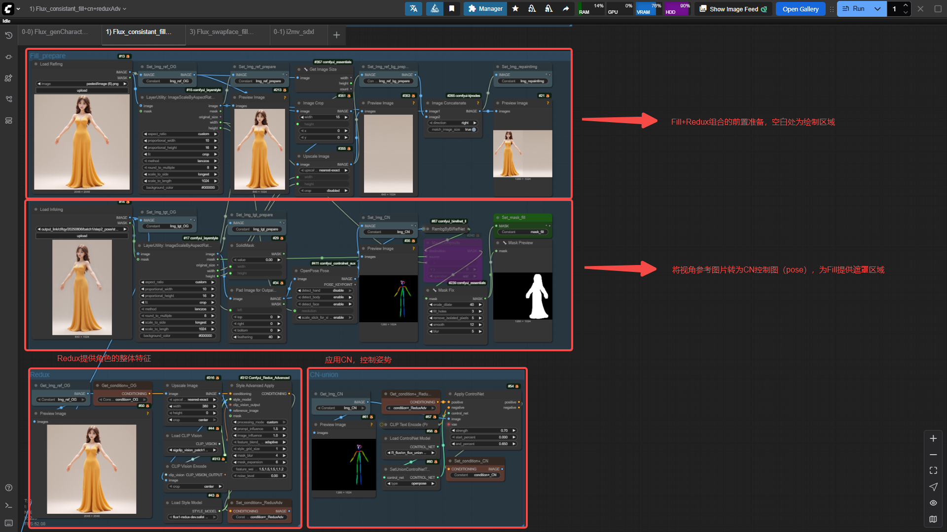 • 利用Fill+Redux的组合,可以生成和T-Pose相似的图片(整体身型,内容,色彩等),但缺点是姿势不能控制。(PS: Comfyui自带的Redux相当强大,极难更改姿势信息,建议使用Redux Adv)