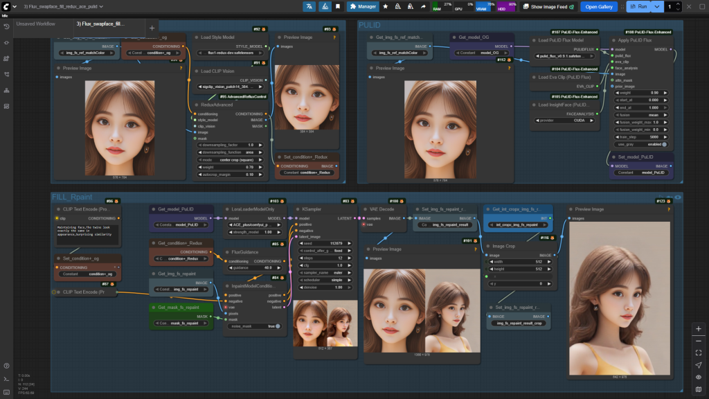 • 通过Fill重绘,对截取后图片的脸部区域进行重绘,此处同时采用了PuLID+Redux+Ace(Potrait)进行脸部特征提取。